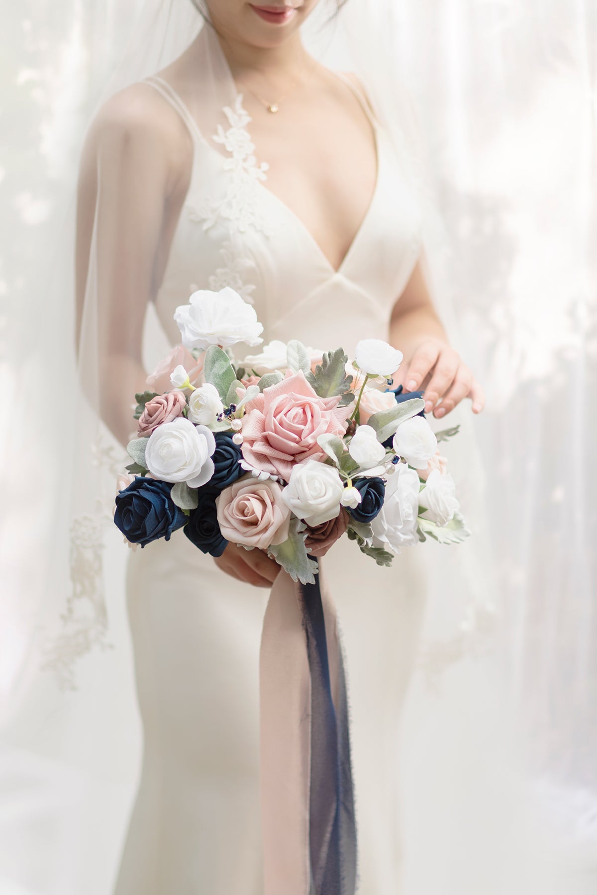 - Size: The bouquet is approx. 9" wide by 13" tall. There are 4 chiffon ribbons in total . including dusty rose . blush . dusty blue . and navy. Each ribbon is approx. 1.5" W x 3.25 ft L.