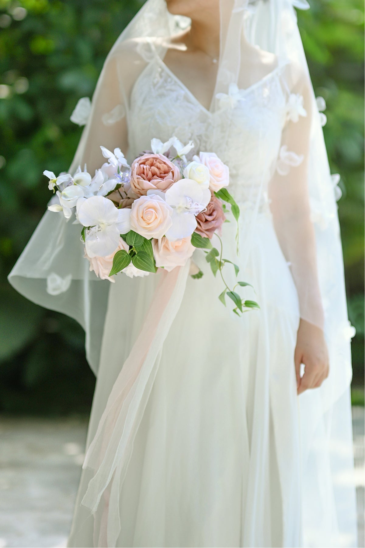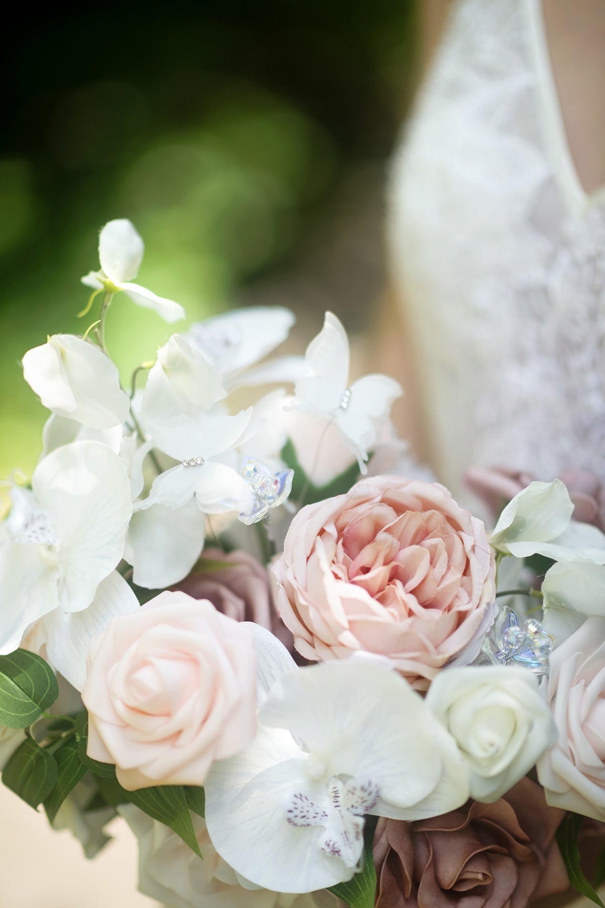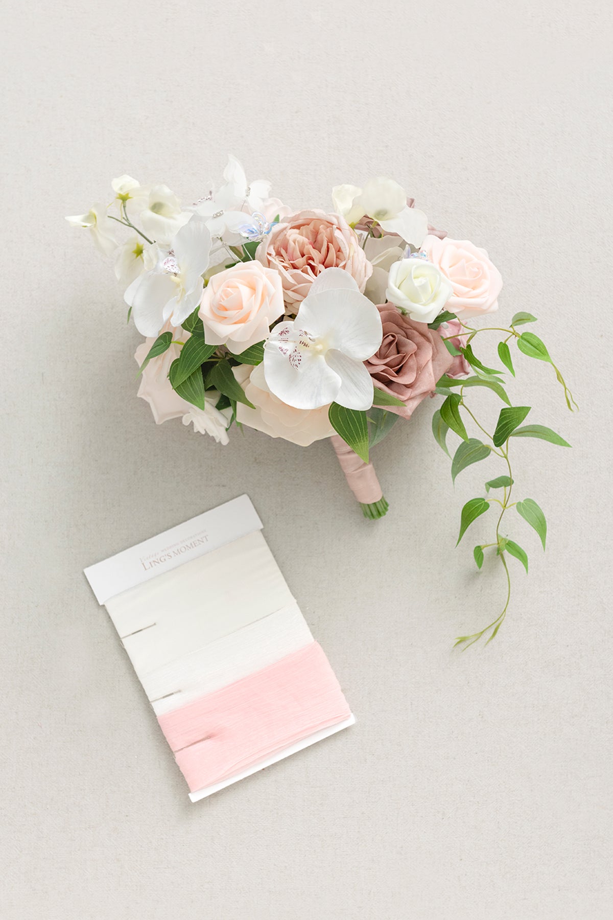 - Silk flowers include white phalaenopsis . blush blooming peony . dusty rose Austin rose . and ivory pea flower.
