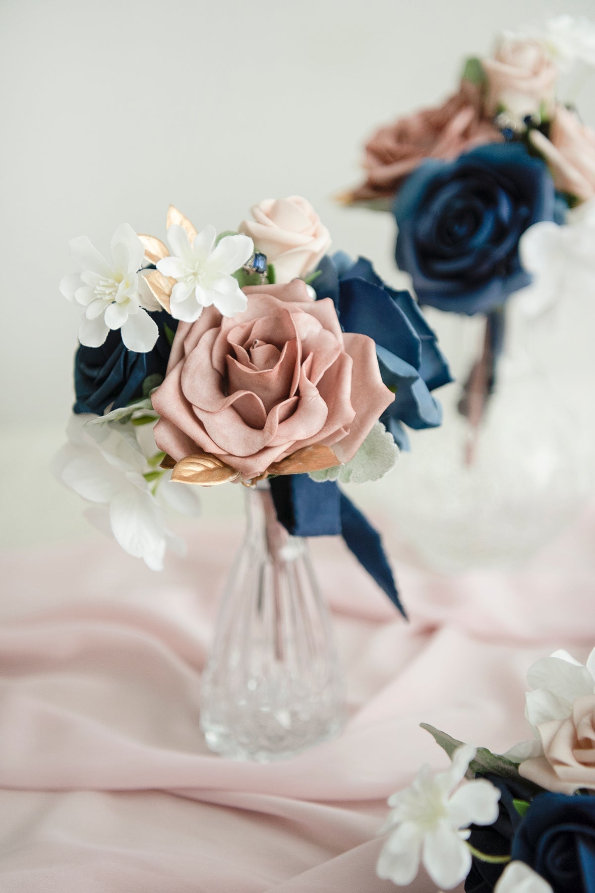 - Materials: This set was made with navy blue rose . nude rose . dusty rose avalanche rose . and rose-filled with golden leaves . white mini flower . white ranunculus . flocked lambs ear leaves . and eucalyptus leaf.