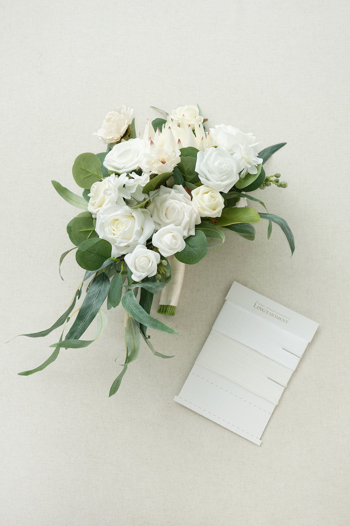 - Silk flowers include Ivory Protea Cynaroides . ivory Vendela rose . ivory pasque flower . and ivory Delphinium flower.