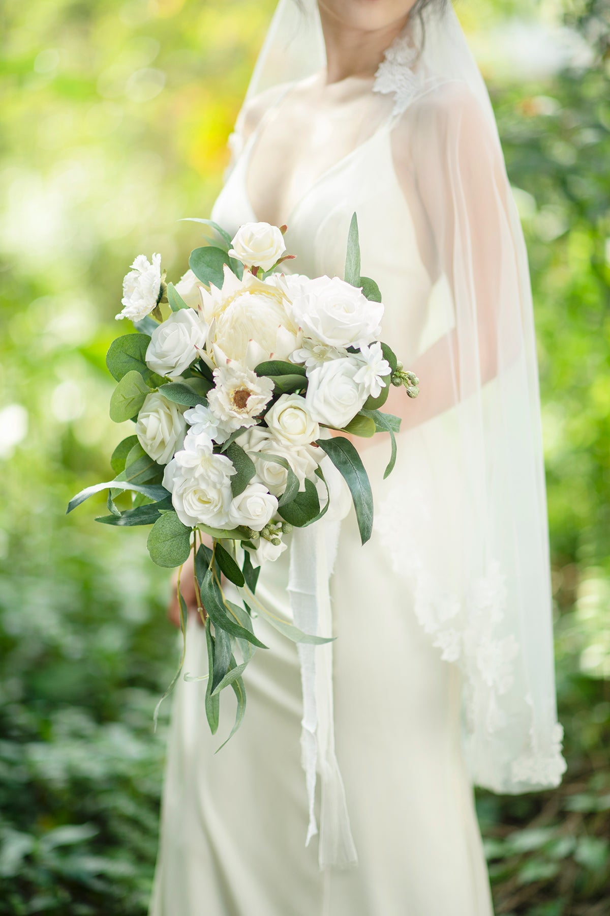 - Size: The bouquet is approx. 9" wide by 15" tall (includes sagging greenery) . one white cotton ribbon is 1.5" W x 3.25 ft L . and one ivory chiffon ribbon is 1.5" W x 3.25ft L.