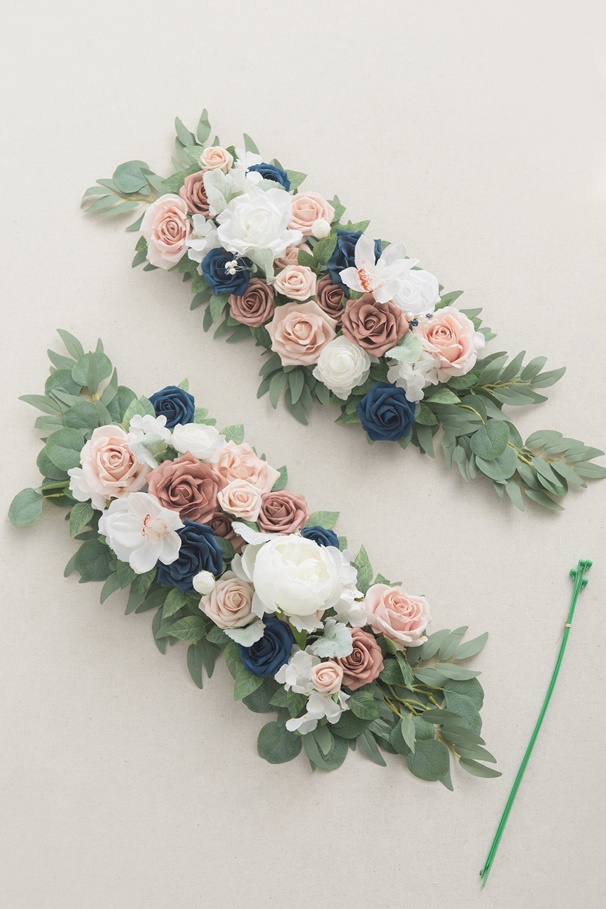 - Materials: These flower arrangements were made with silk flowers and foam flowers. Including dusty-rose rose . navy blue rose . white rose . nude rose . dusty rose avalanche rose; navy blue avalanche rose . nude avalanche rose . ivory blooming peony . white ranunculus . white pasque flower . mini peony . filling with white pasque flower . white pearl . flocked lambs ear leaves . rose leaves . willow leaves and eucalyptus.