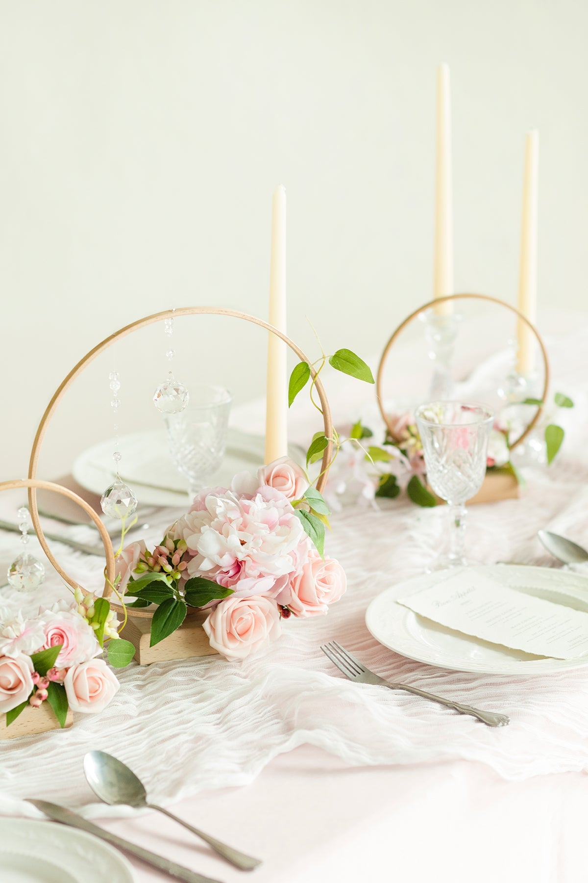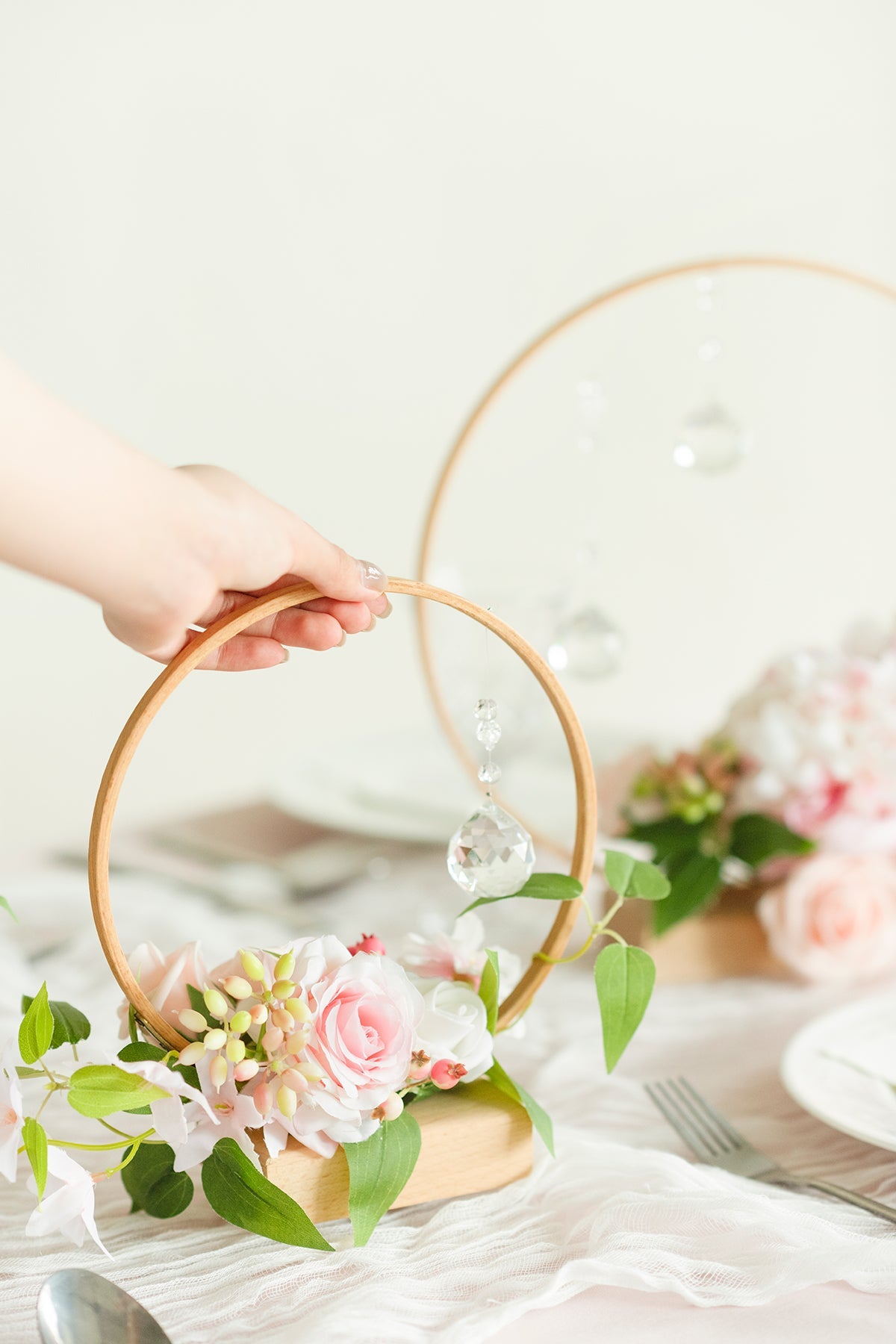 Material: The holders are made of high-quality beech with detailed rustic grains. The floral arrangement is made of real-looking blush rose and peony . dotted with crystal . little berry . and clematis leaves.