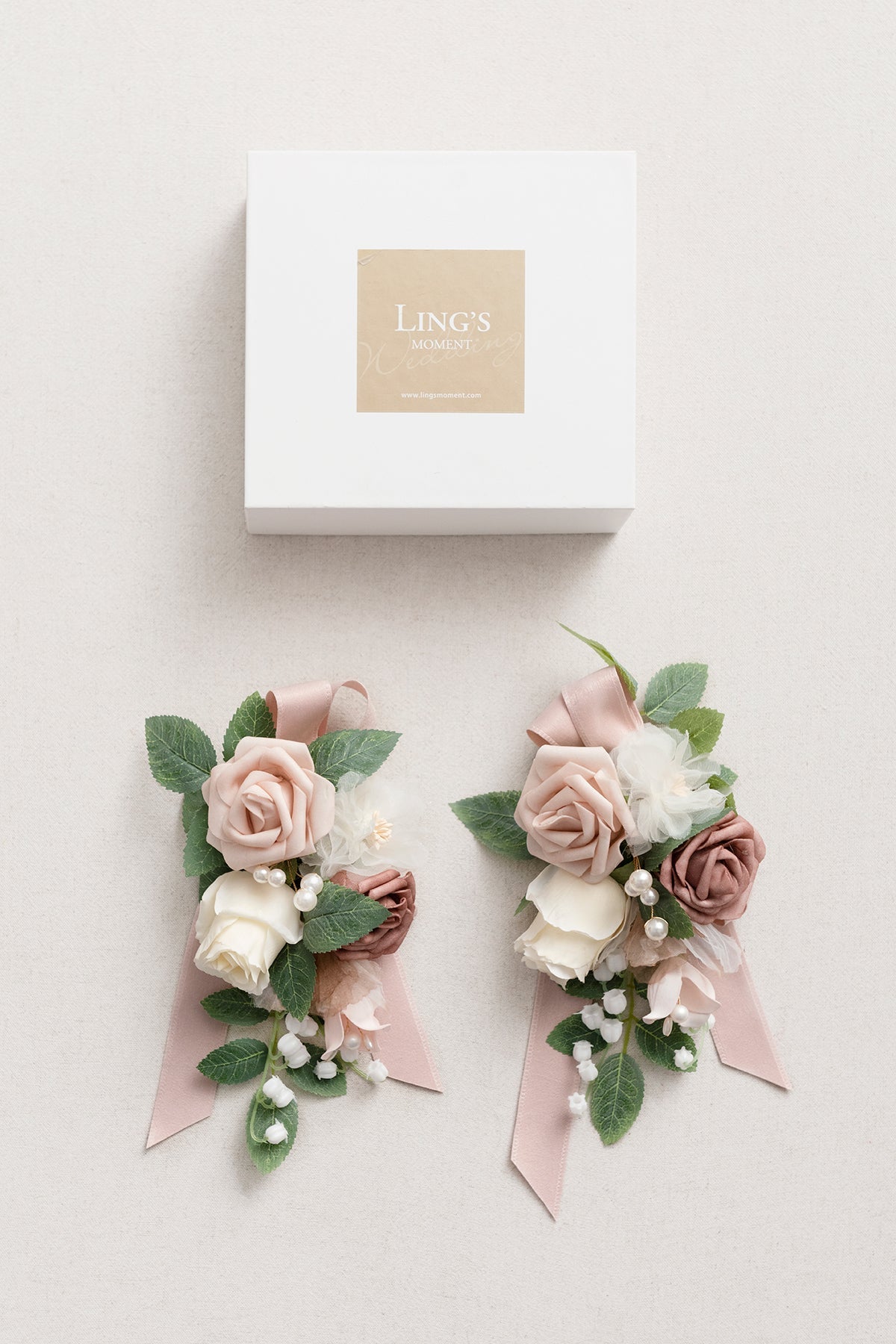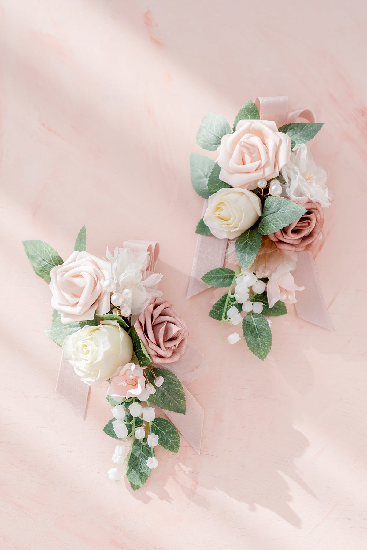 Material: The elegant shoulder corsages are made of ivory real-touch rosebud (a rose that has the shape of a fresh flower's touch and is very similar to a fresh flower) . dusty rose foam petite rose . nude foam petite rose . white silk anemone . blush foam gardenia bud . lily of the valley . white gauze flower . accented with sage green rose leaves . pearl floral pick.