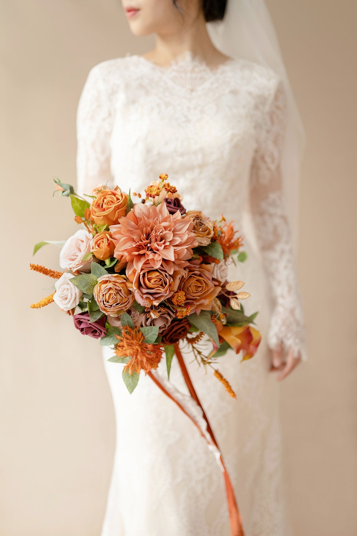 Silk flowers including orange clay dahlia . burnt orange cabbage rose . burnt orange dried Escimo rose . french yellow Vendela rose . cream Austin rose . burnt orange threadlike spider mums . burnt orange calla lily.