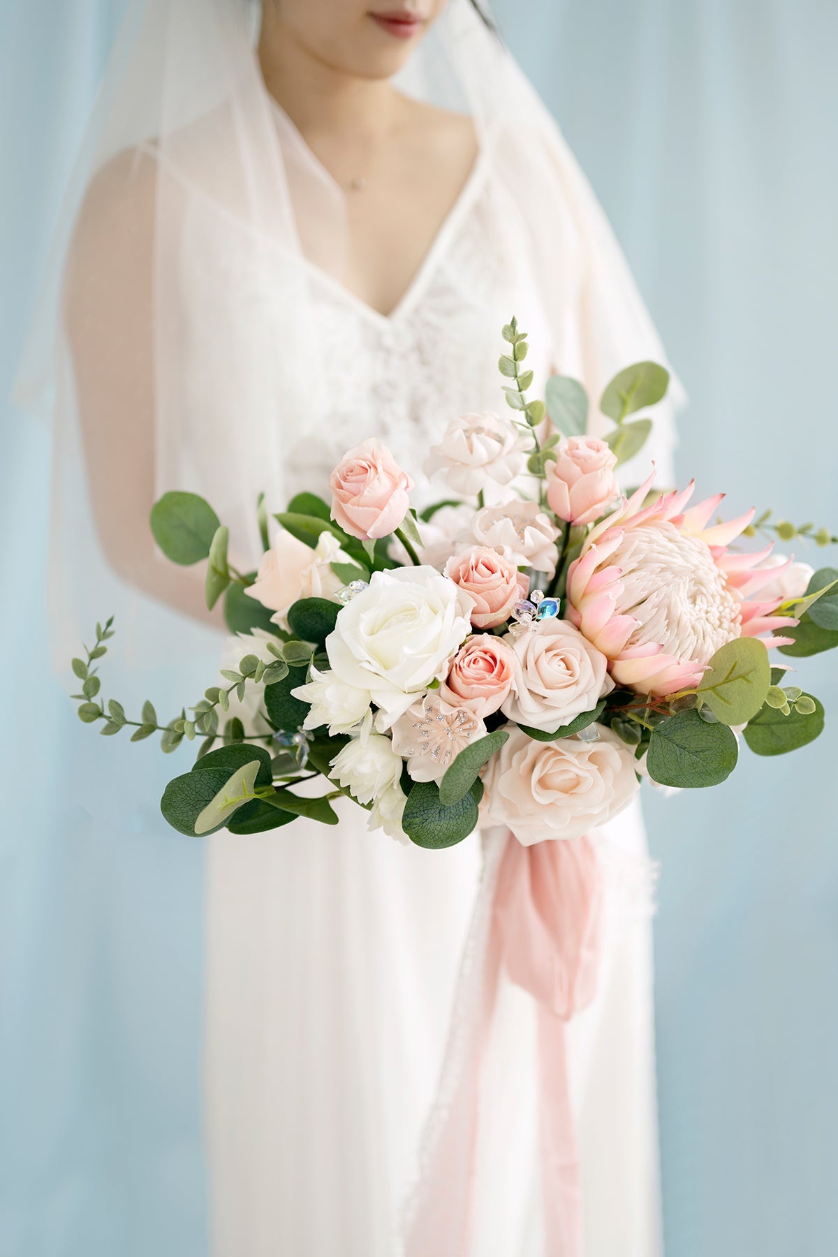 - Silk flowers include blush protea flower . ivory Vendela rose . blush petite rose . blush blooming peony . white hydrangea . and ivory bridal flowers.