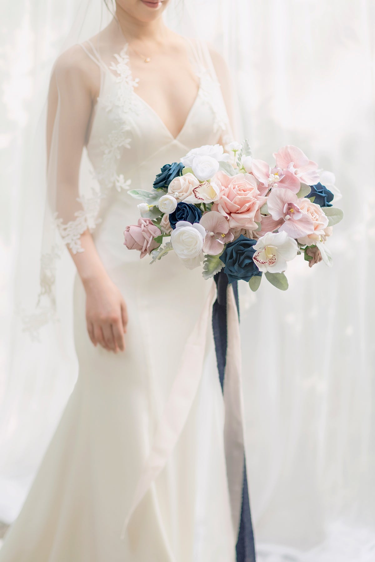 - Package: A 11" bridal bouquet with 4 ribbons wrapped on a card( blush . dusty rose . dusty blue . and navy blue). Easy to add your bouquet ribbon warp style.