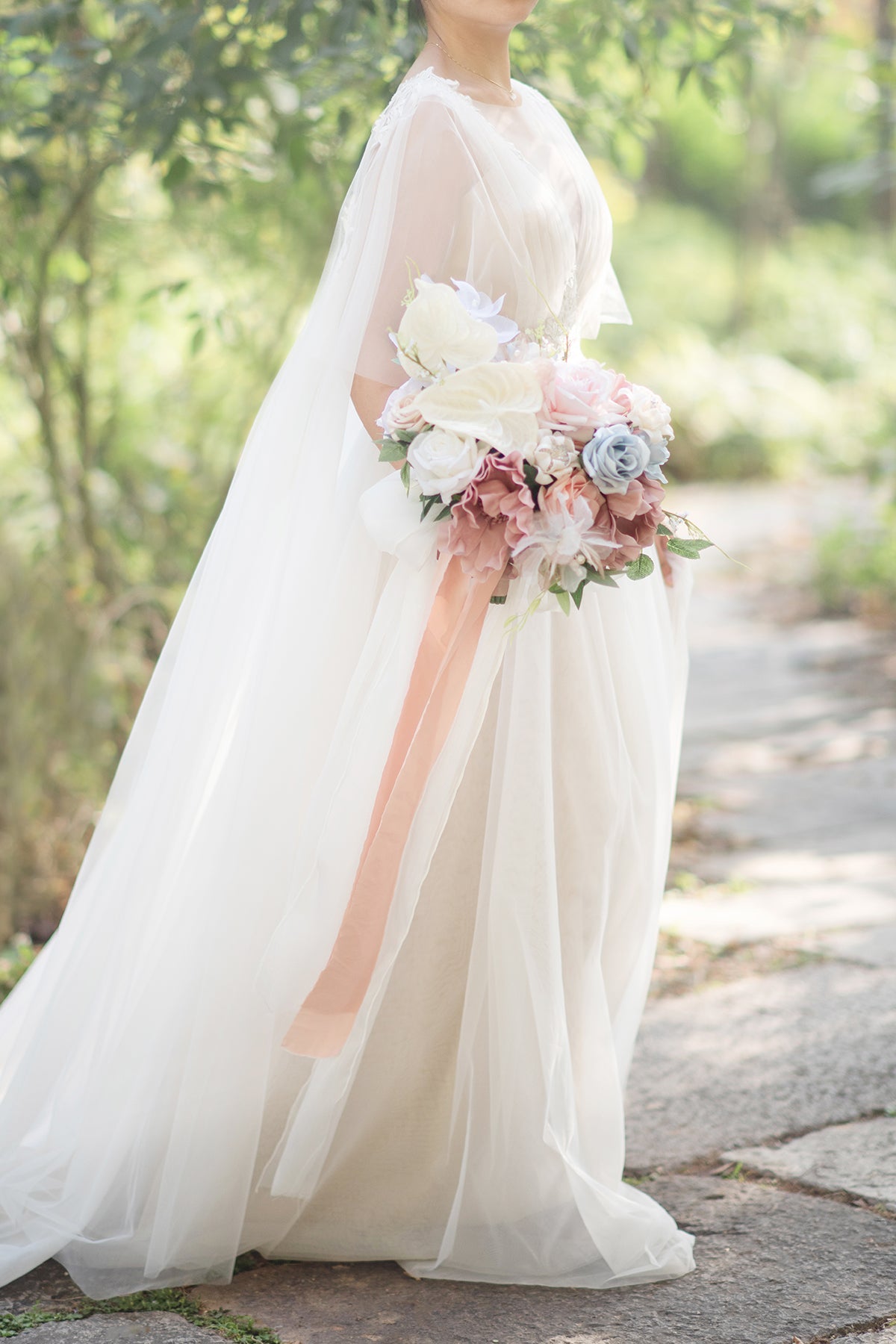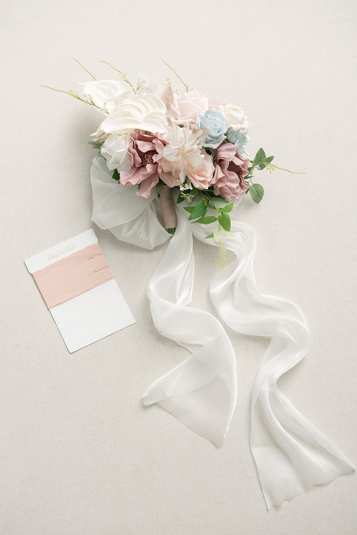 - Size: The bouquet is approx. 11" wide by 12" tall. The white silk ribbon is pre-tied to the bouquet and the length of the sagging silk ribbon is approx. 30". One blush chiffon ribbon is 3" W x 3.25ft L.