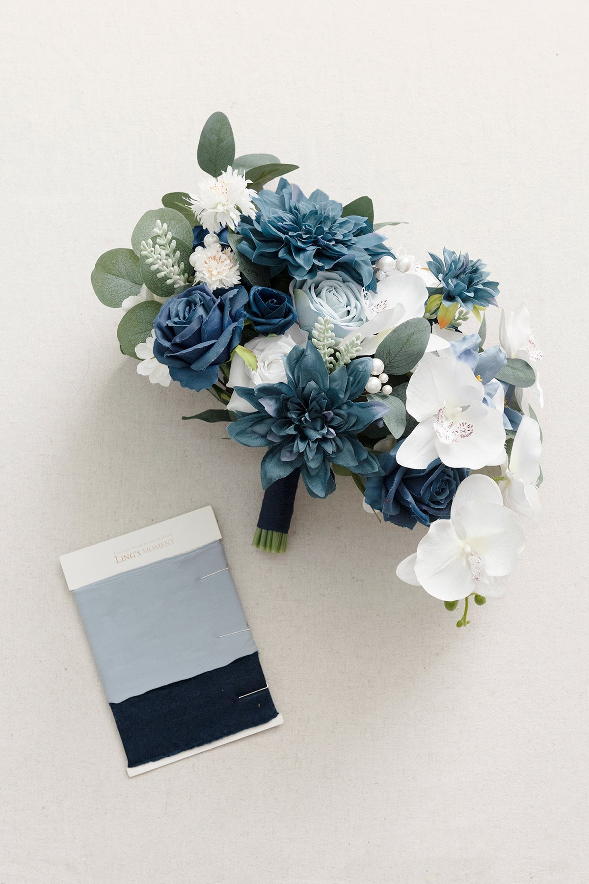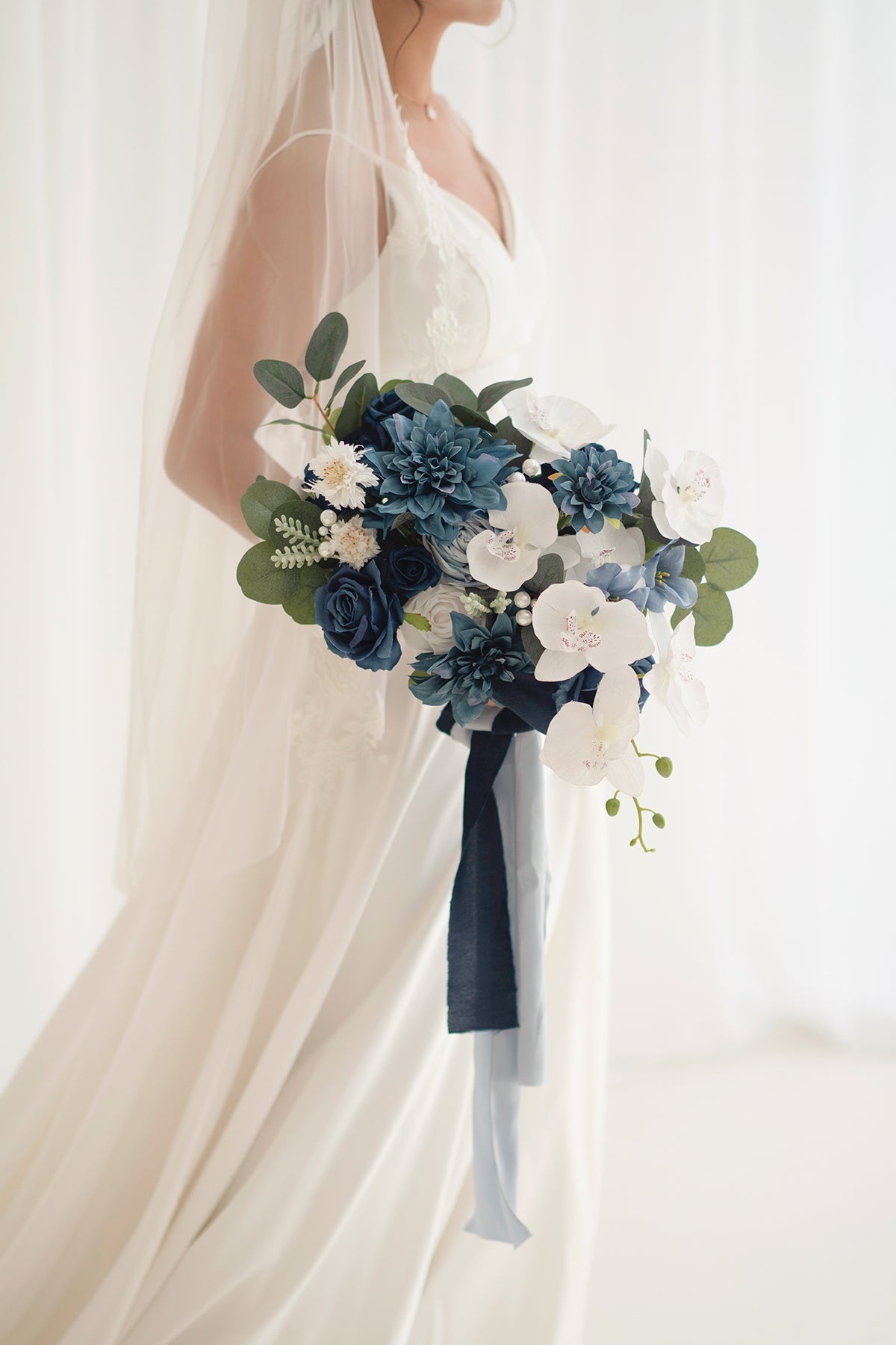 - Package: Bridal bouquet x1 (approx. 11" wide by 13" tall) . attached with 13-inch light blue and navy blue chiffon ribbon.