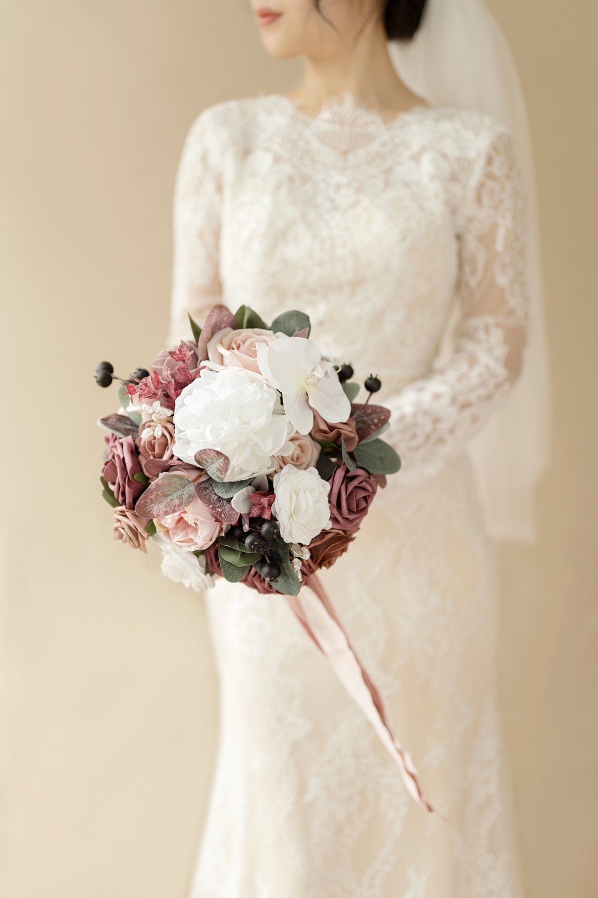 - Materials: Made of high-quality silk/foam flowers and silk greenery. Silk flowers include dusty rose avalanche rose . dusty mauve Austin rose . white phalaenopsis . and white peony. Foam flowers include dusty rose high-centered rose . dusty rose avalanche rose . and mauve rose. Decorated with flocked silver dollar eucalyptus leaves . mauve seeded eucalyptus leaves . dark green eucalyptus leaves . and blueberry.