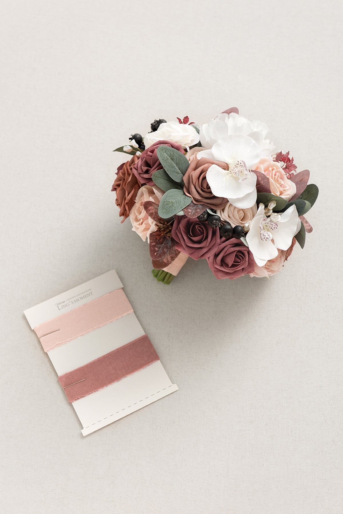 - Package: Bridal bouquet x1 . approx. 11" wide by 13" tall. Comes with 1 dusty rose chiffon ribbon and 1 dusty mauve chiffon ribbon.