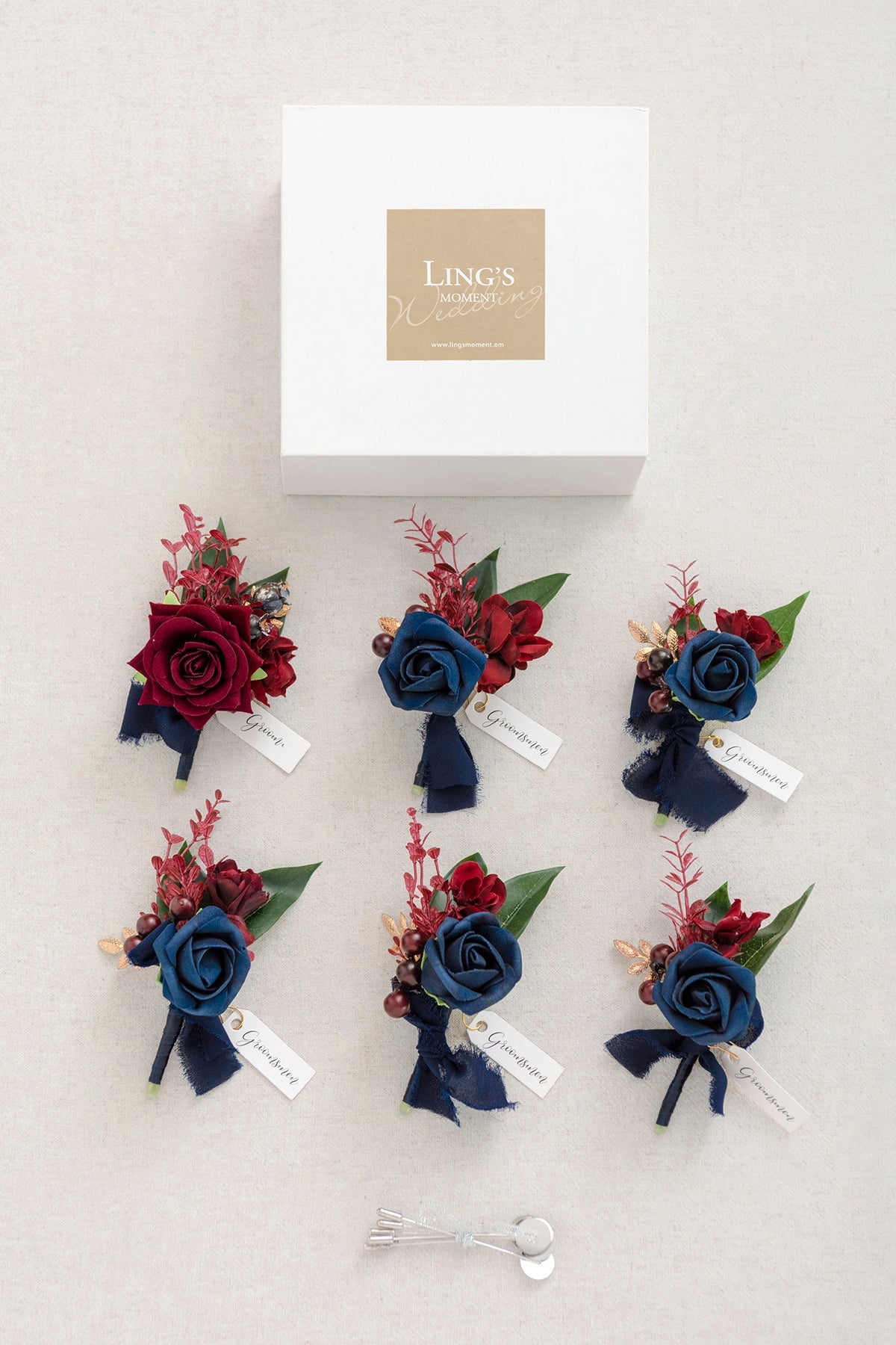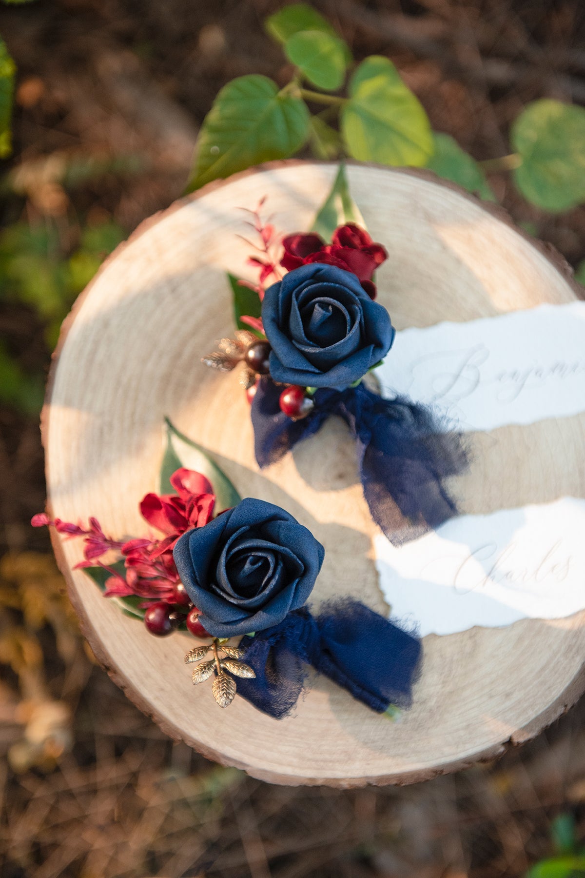 - Material: Made of navy blue foam rosebud . burgundy hydrangea . and burgundy fruit. All boutonnieres did dot with laurel leaves . burgundy branches . and golden leaves. Tied with navy blue ribbon.