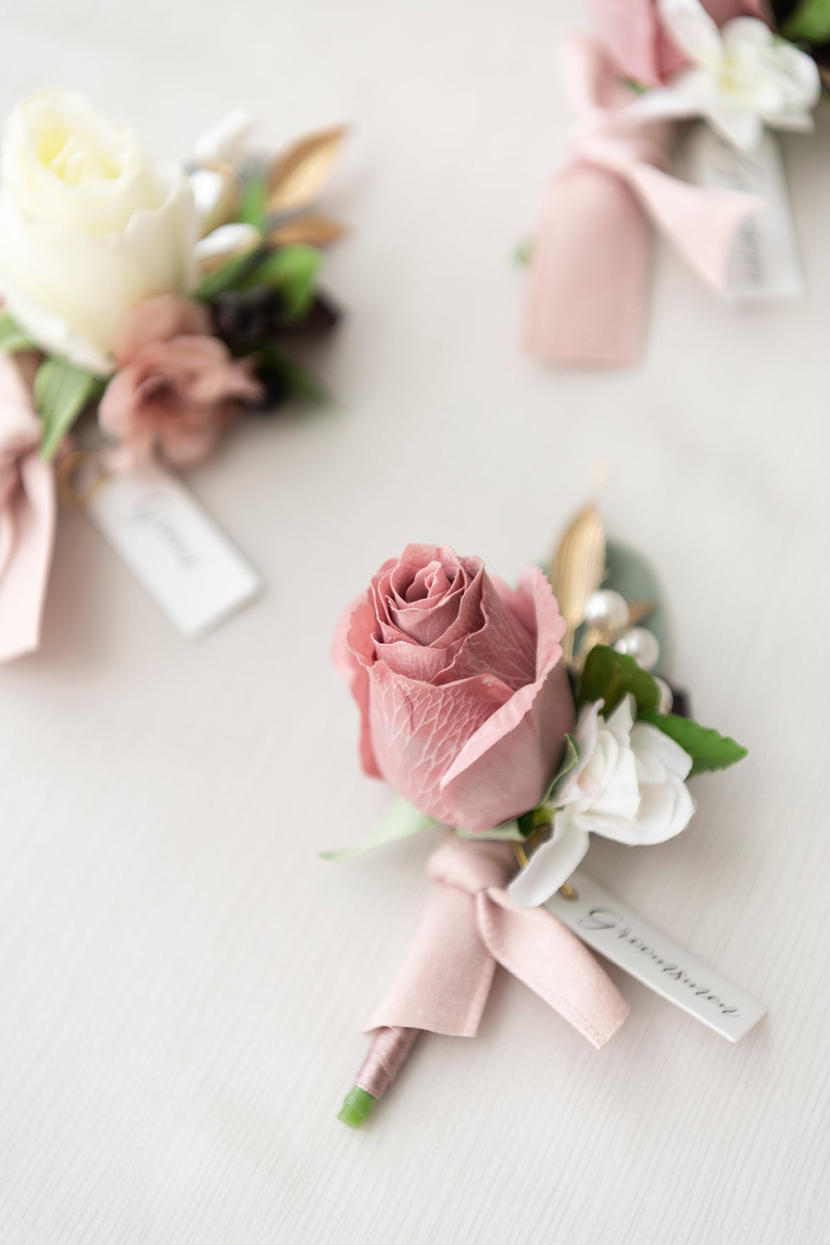 • Materials: All boutonnieres are made of real touch petite rose (a rose that has the shape of a fresh flower's touch and is very similar to a fresh flower) . dusty rose and ivory petite rose . ivory delphinium . elm leaves . golden bamboo leaves . pearl floral pick. The exquisite and vintage ivory boutonniere may stand out to the groom.
