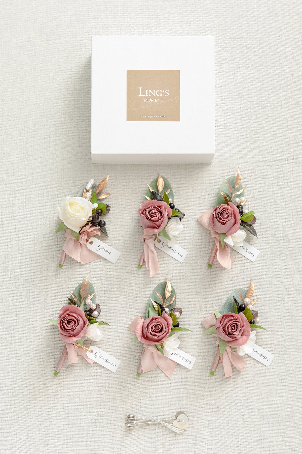 • Package: Set of 6 boutonnieres . including 1 specially designed for the groom . with pins.
