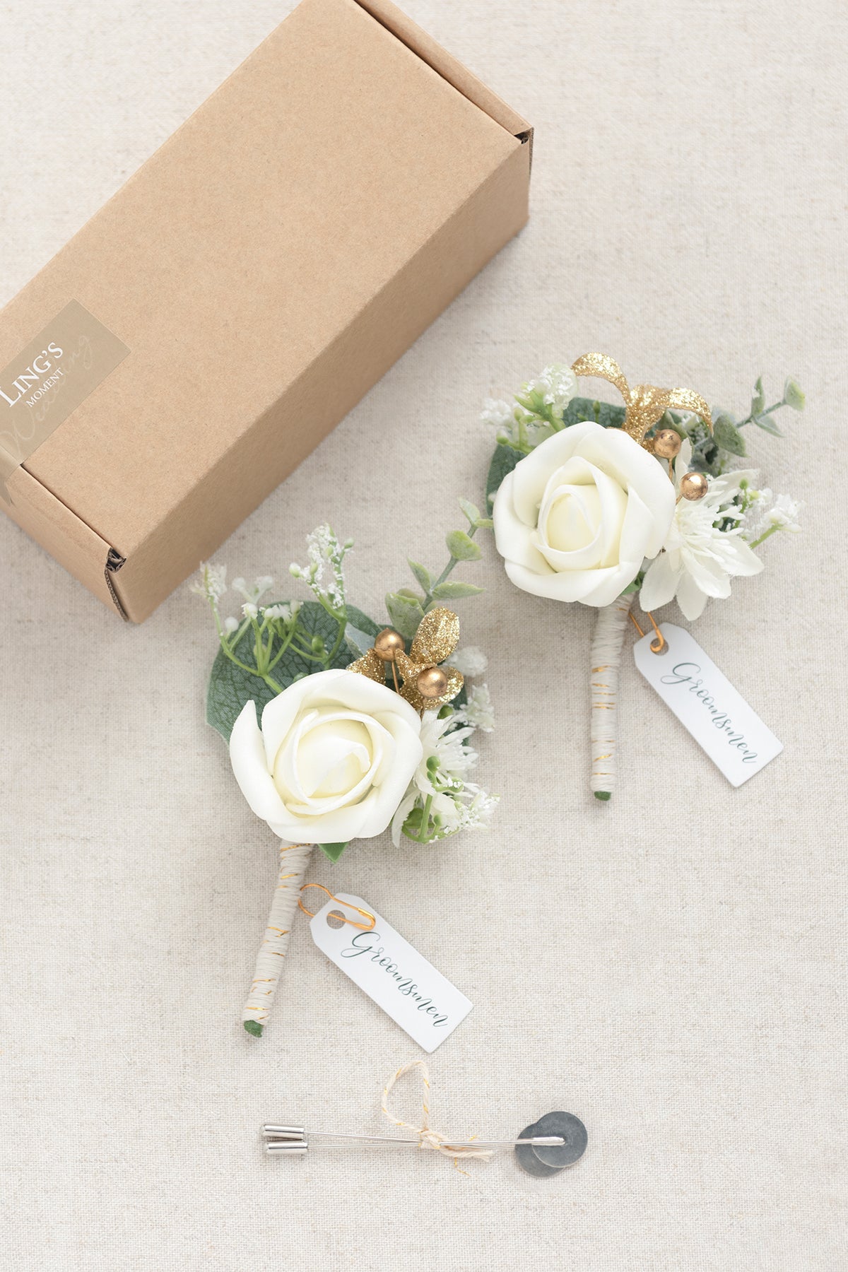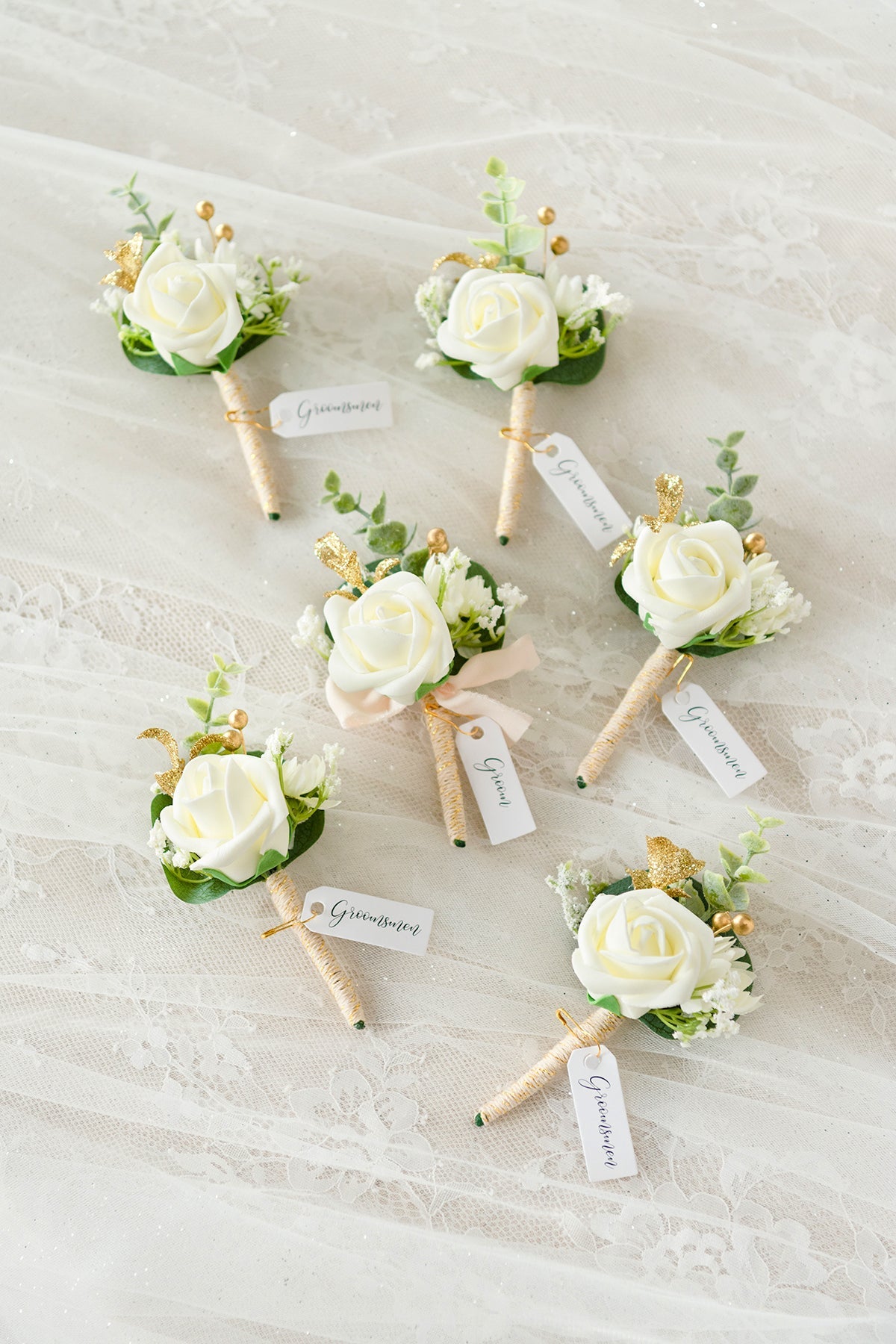 - Material: The boutonnieres are made of beautiful and real-looking ivory roses . dotted with little white flowers . silver dollar eucalyptus . and dusty spiral eucalyptus