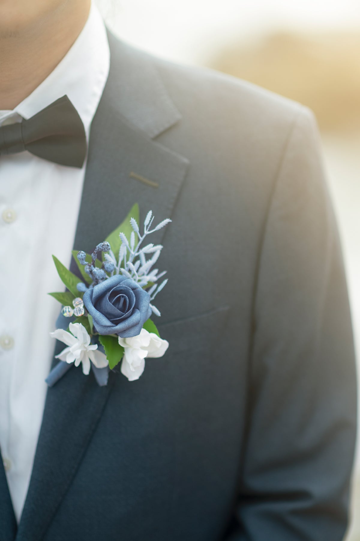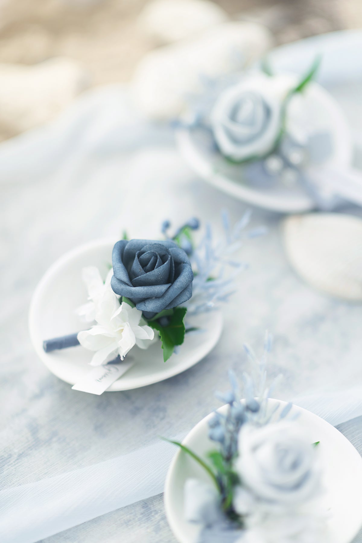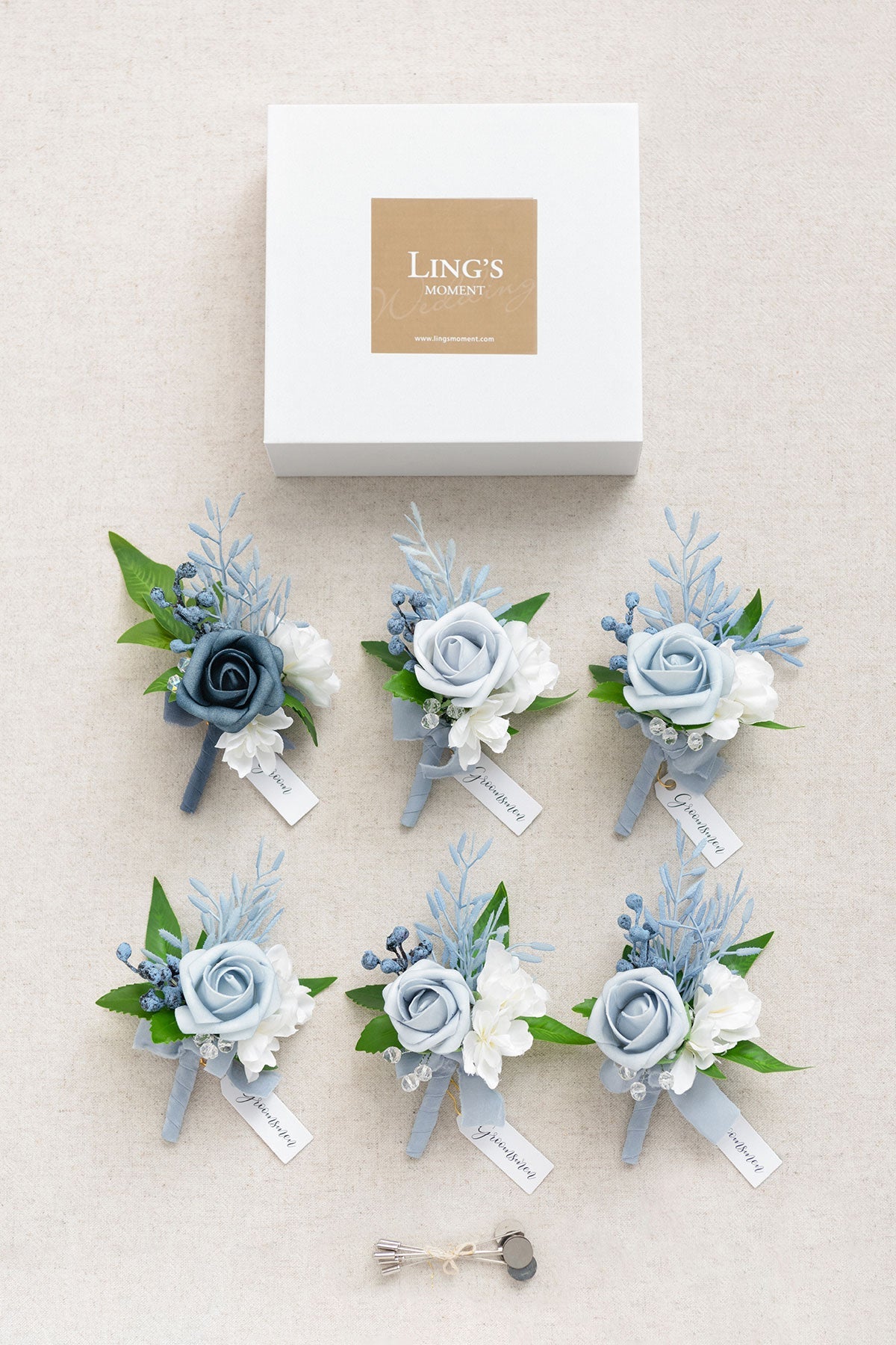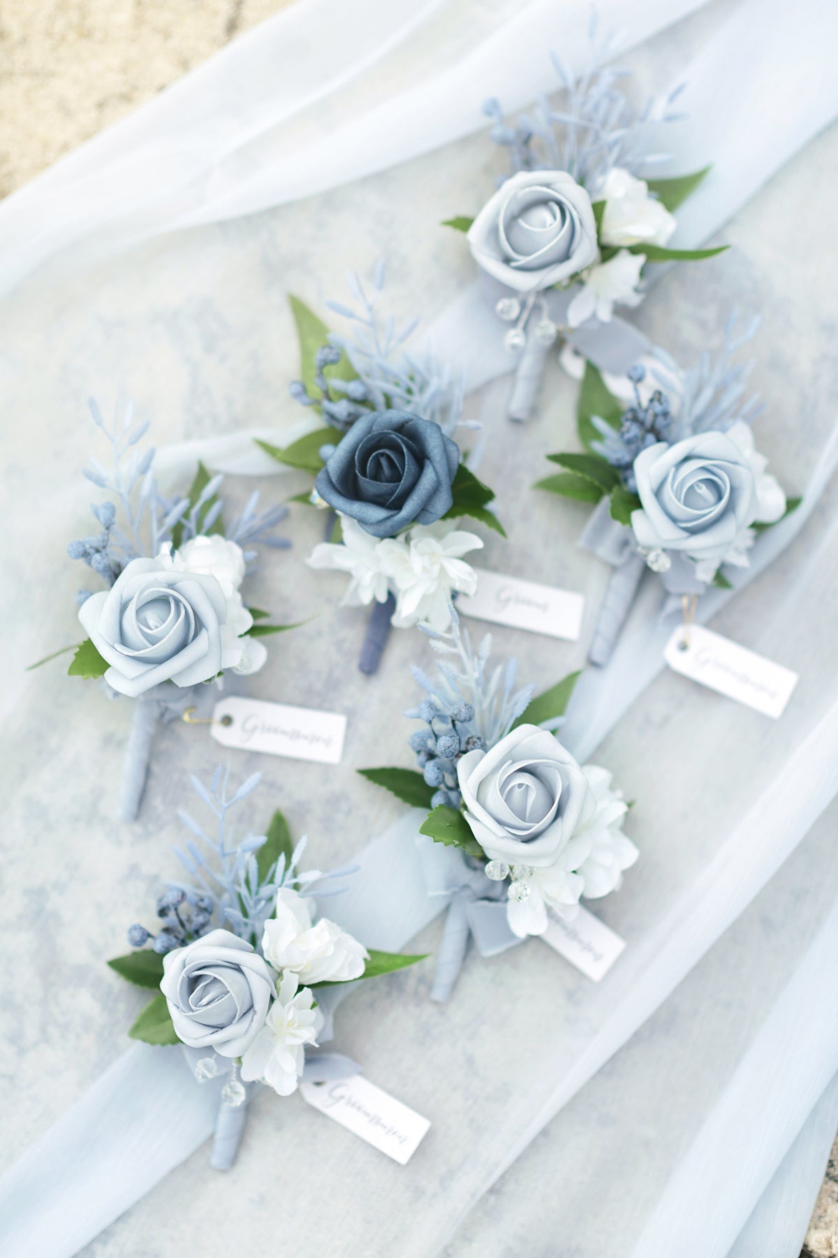 - Great Value: A set of 6 boutonnieres may fit the number of the groom and groomsman. This exquisite and romantic dusty blue boutonniere will be a perfect decor for the groom and his brother and any other male guest.