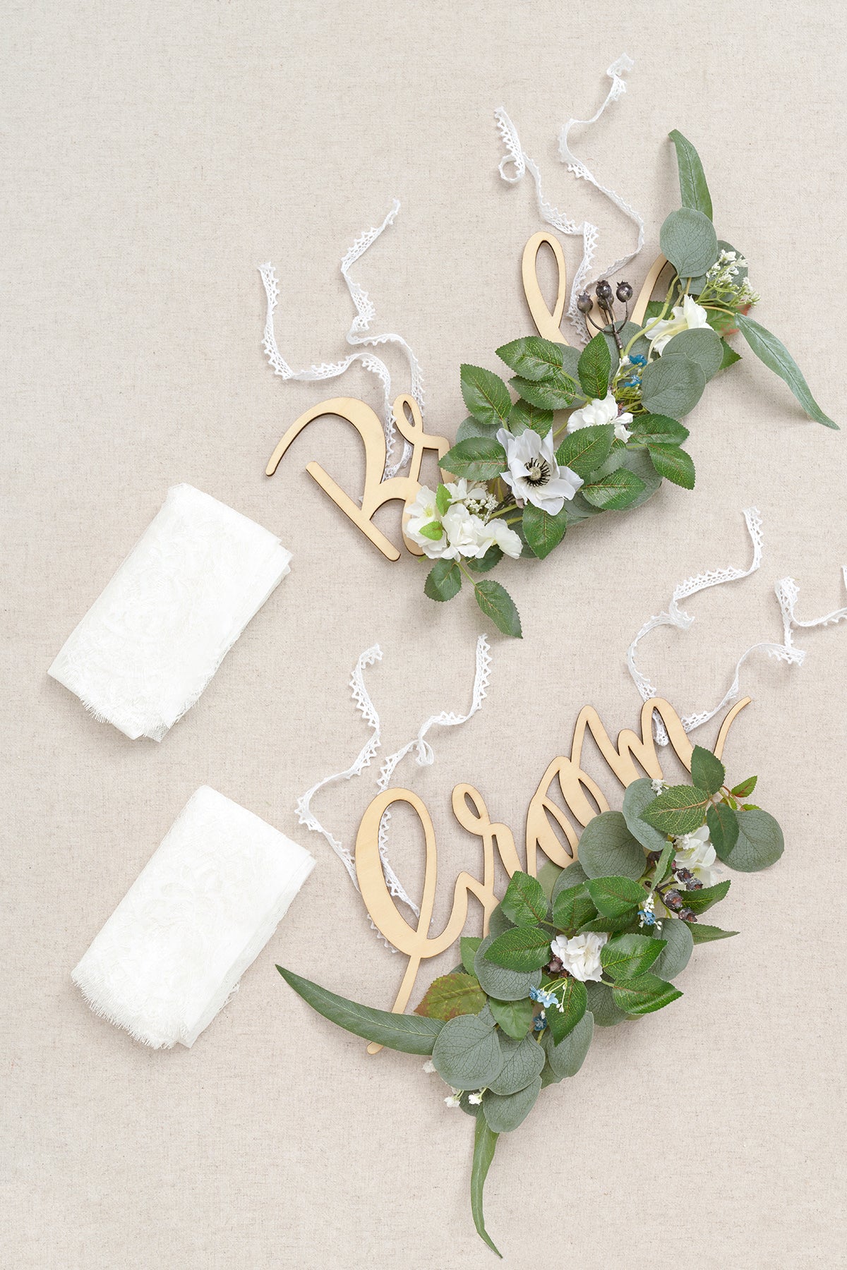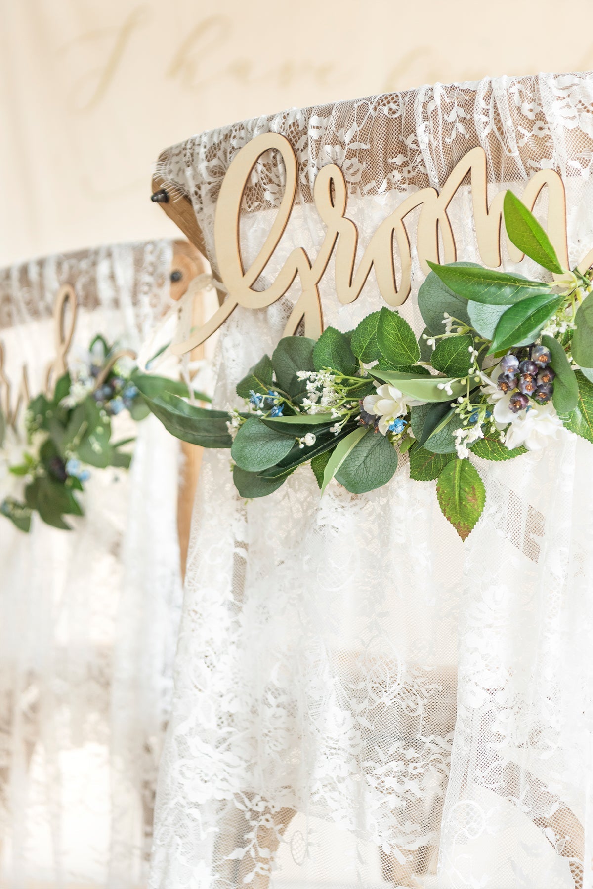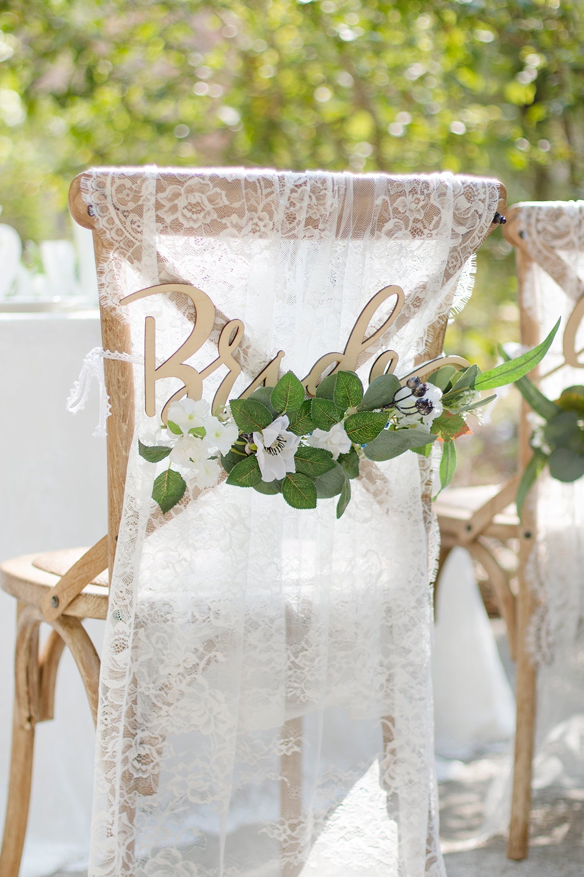 Package: Pre-Made bride sign x1 and groom sign x1 with greenery decor . with lace chair decor x2.