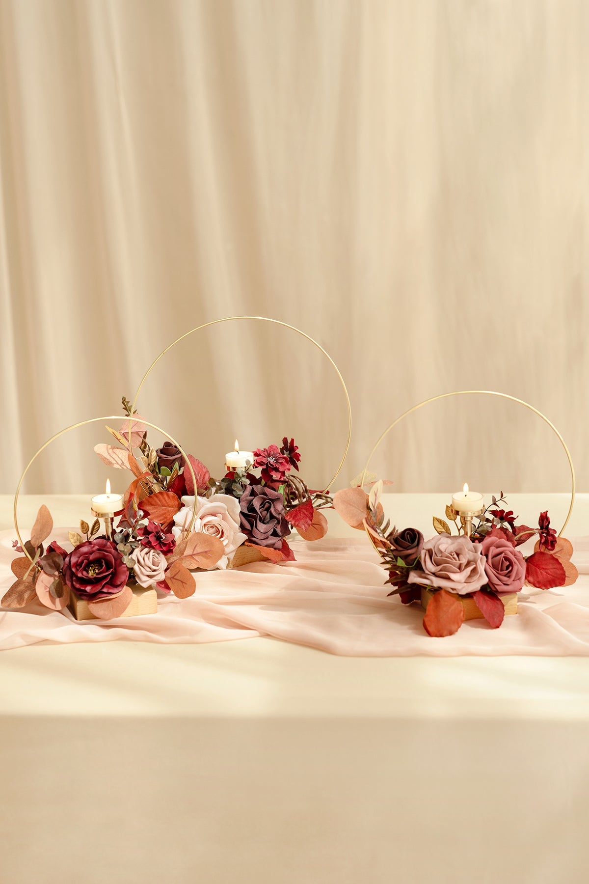 - Material: The flower arrangement is mainly made of silk/foam flowers . including real-looking dusty rose rose . black baccara rose . burgundy camelia . burgundy rose . dusty rose avalanche rose . black baccara avalanche rose . filled with golden leaves . black baccara eucalyptus . burgundy ranunculus . walnut brown bracken . and terracotta dollar eucalyptus. The holders are made of high-quality gold ring candle holders and wooden bases.
