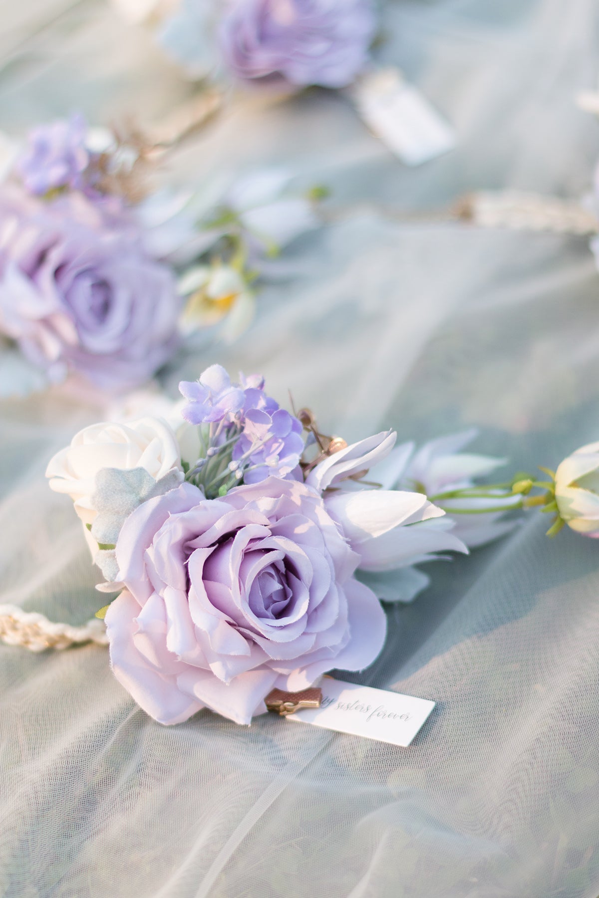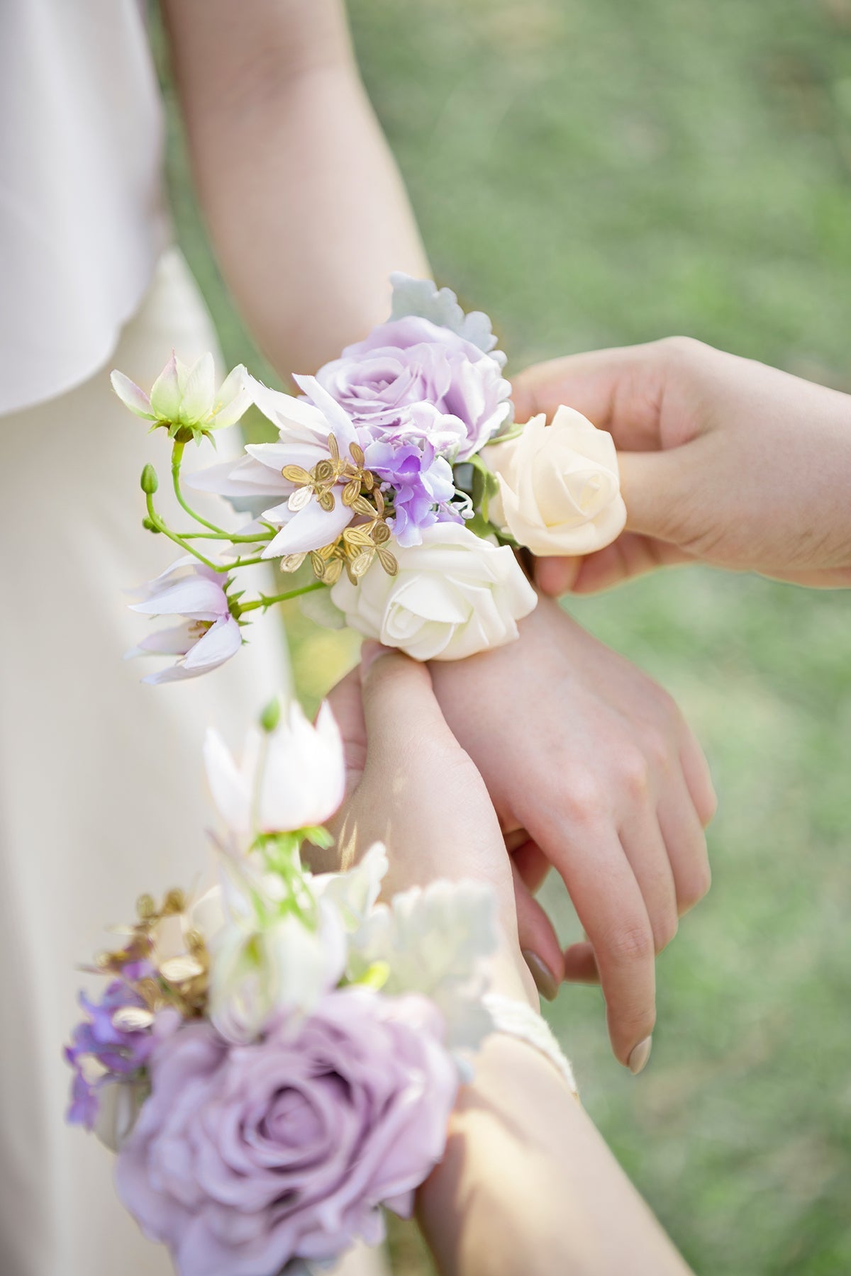 - Material: The luxurious wrist corsages are made of artificial Lavender Vendela rose . ivory and cream petite rose . Blushing bride flower . and lavender Hydrangea accented with Willow Dusty Miller . golden leaves.