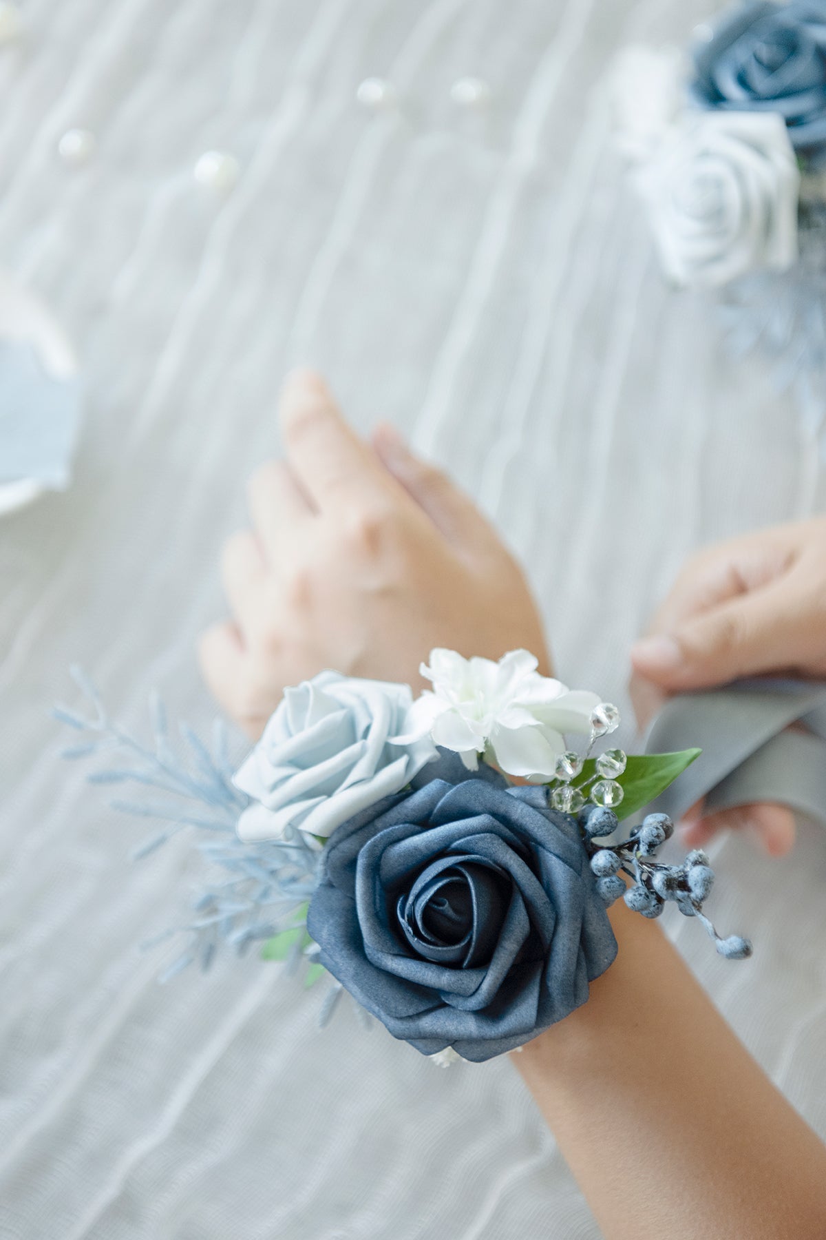 - Great Design: It is a wrist corsage. Comes with clips and ribbons . and it can be tied to the wrist as a wrist corsage by a ribbon. Only need a simple action to meet your different display needs.