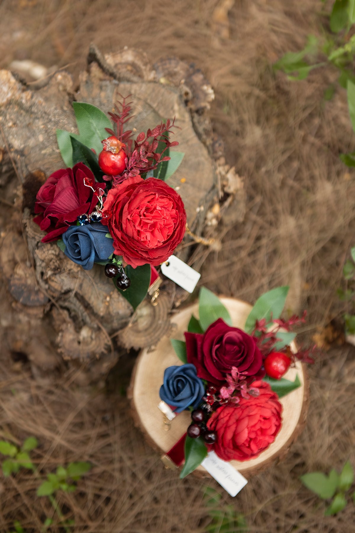 - Material: The elegant wrist corsages are made up of artificial dark red blooming peony . burgundy hybrid tea rose and navy blue petite rose . accented with laurel leaves . pomegranate fruit . burgundy spray . holly fruits . and jewel floral pick.