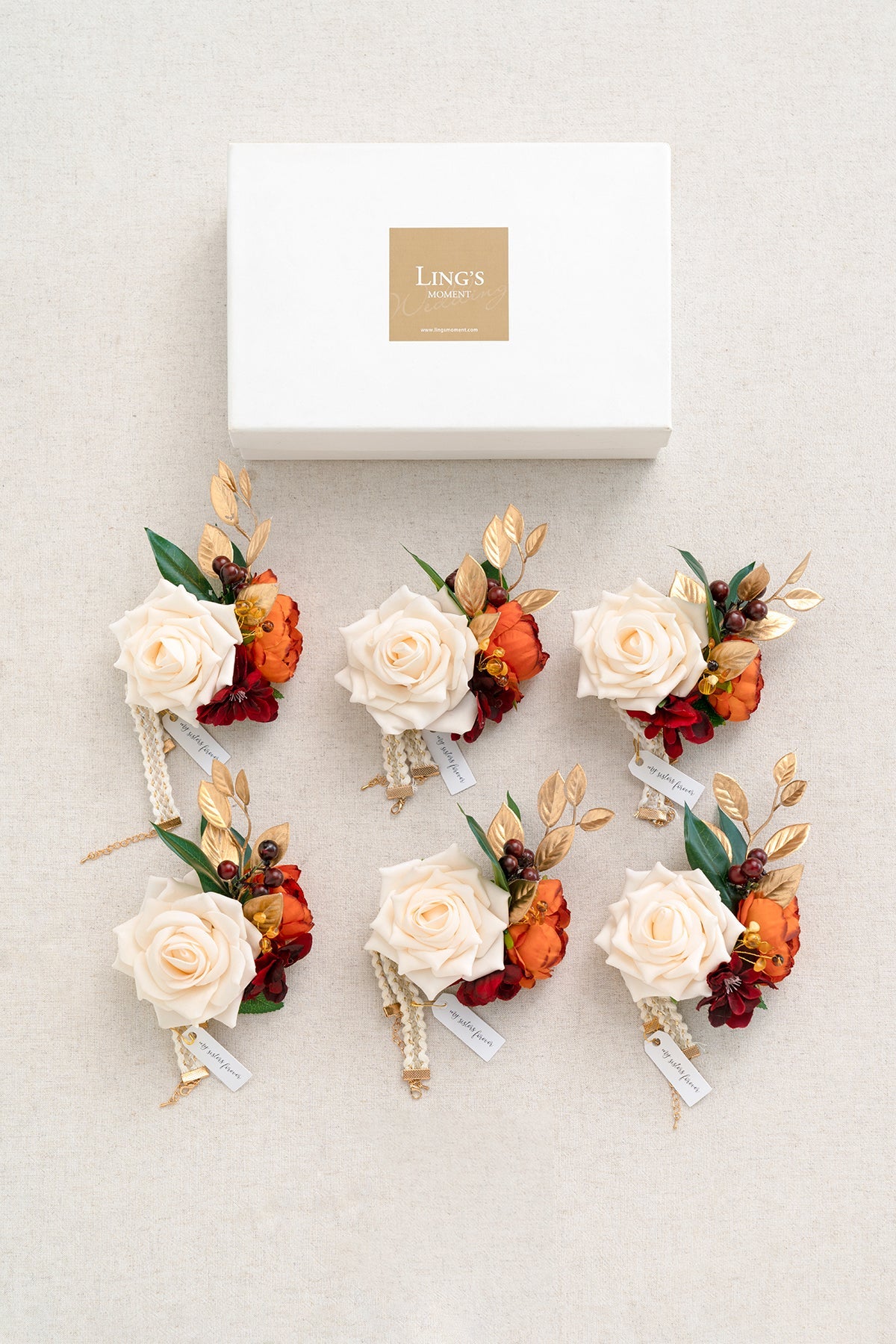 - Material: The elegant wrist flower is composed of artificial cream foam hybrid tea rose accented with burnt orange peony . gold leaves . holly fruits . amber floral pick . and burgundy delphinium. This corsage wristband is filled with cream . amber . and burgundy details.